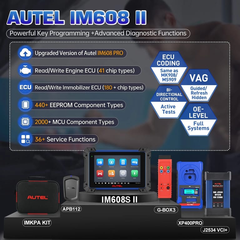 Autel MaxiIM IM608 PRO II (IM608S II) Full Kit includes the IM608PRO II, Plus IMKPA Accessories with G-Box3 and APB112 all together. With IMKPA and the XP400Pro, you can Read/ Write/ Erase for Mercedes Benz ESL_W209 / W906 Data, for Mercedes Benz NEC Key Learning, for BMW EWS3 Key Learning and. For Volkswagen/ AUDI/ BMW/ Benz Key Unlock.