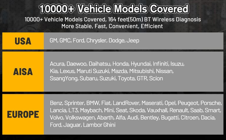 Benz, Sprinter, BMW, Fiat, LandRover, Maserati, Opel, Peugeot, Porsche, Lancia, LT3, Maybach, Mini, Seat, Skoda, Vauxhall, Renault, Saab, Smart, Volvo, Volkswagen, Abarth, Alfa, Audi, Bentley, Citroen, Dacia, Ford, Jaguar, Lambor Ghini