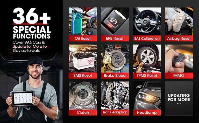 Oil Reset / EPB Reset / TPMS Reset / BMS / Brake Bleeding / Aftertreatment / IMMO Keys / Injector Coding / SAS Reset / Suspension / Throttle / WIN DR ROOF / Seats / ODO Reset / Lang Change / Headlamp / CHG Tire Size / TEC Learning / ABS SRS / Cylinder / VTG Learn / Speed & PTO / Clutch Reset / Trans Adaption / Airbag Reset / A/F Setting / etc.