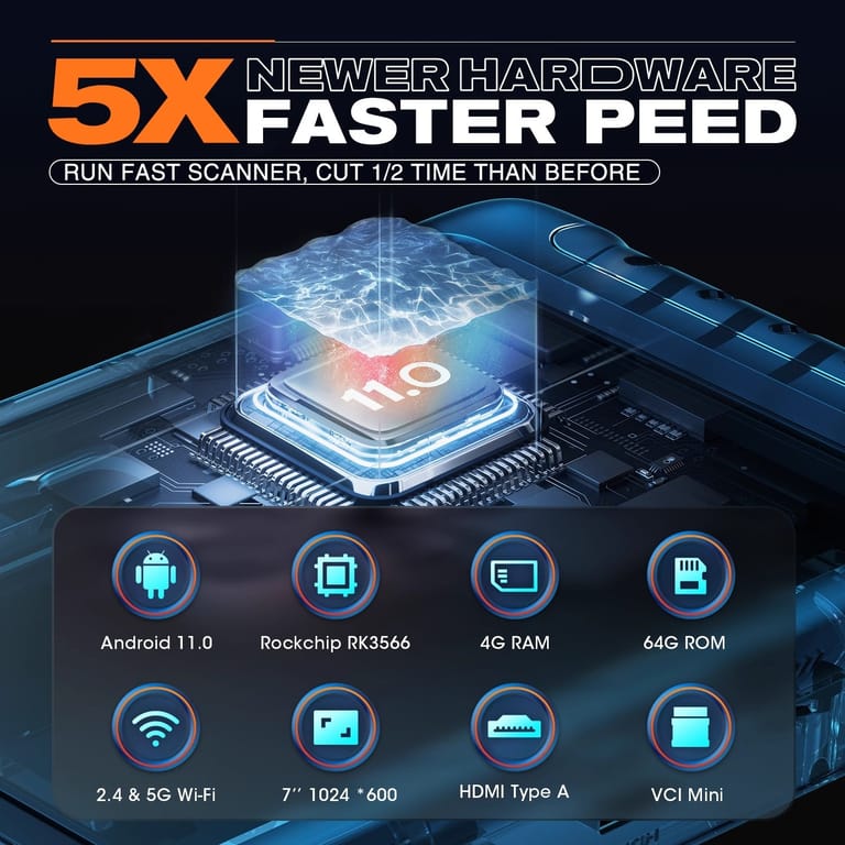The MaxiDAS DS808S-BT features a powerful Rockchip Rk3566 1.8 GHz processor and 4GB RAM + 64 GB onboard memory. It offers technicians an extensive service menu, enabling them to quickly perform the most common service tasks.