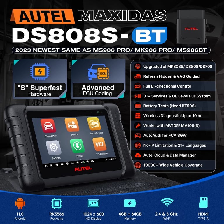 Autel MaxiDAS DS808S-BT auto diagnostic tablet is specially designed for DIYers and auto technicians that enables in-depth dealer-tool grade diagnostics on all available vehicle modules including ECM, TCM, ABS, Airbag, BCM, Parking/Steering/Suspension/Radio, Lighting/HVAC systems and etc to pull codes, retrieve freeze frame & ECU Info, clear codes, reset monitors and turn off warning lights, perform active tests like EVAP test, Idle Relearn to pinpoint fault locations efficiently