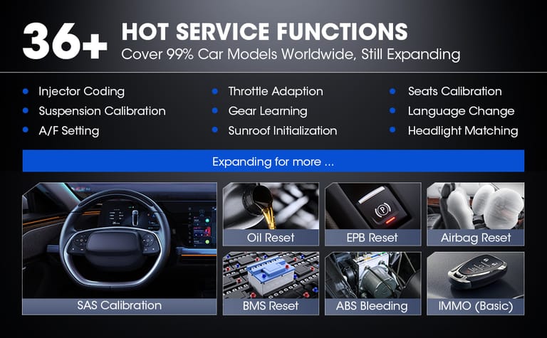 4. 36+ Services & Initialization & Adaptation & Calibration: BMS, EPB, ABS Bleeding, Oil Reset, SAS, DPF, Throttle Relearn, Headlight Adjustment, Disable Transportation, Crankshaft Resync, Air Suspension, Window Initialization, Airbag Repair, Cylinder Power balance, VGT Learn Gearbox Match, TPMS Full Functions, Seat Calibrations, etc