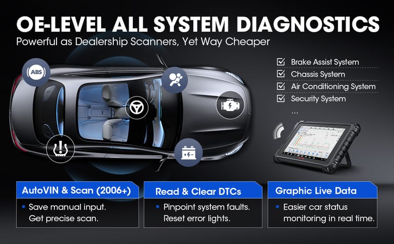 Out test results shows that it has much wider compatibility and can even support some of the latest car models in 2021, able to access all electrical systems like ABS, SRS, TPMS, Engine, IC, Transmission, BCM, Chassis, Steering, Airbags, Air Conditioning, IMMO, Air Suspension, Air Suspension, Cruise Control, etc., able to scan all vehicle systems to read/ clear codes, view live data, freeze data frame, turn off the light to resolve vehicle issues. Its all system diagnosis ability is equal to the Same as MaxiSYS Elite/MS908/ MK908/ MK908P.