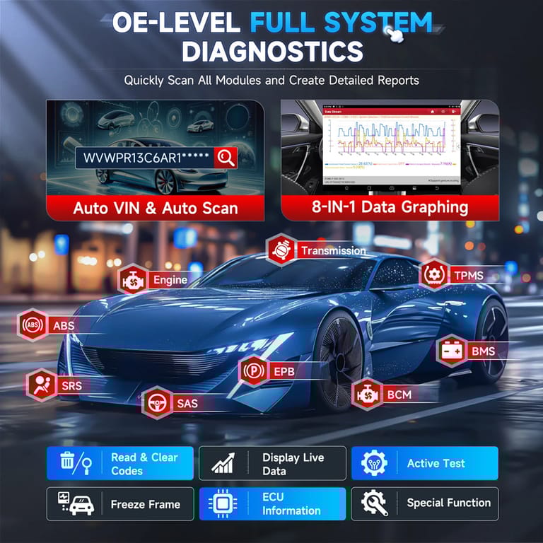 You can easily get the VIN information of the car, and do a full scan for your car & get a diagnostic health report.It provides full system diagnostics for a wide range of vehicle systems, including ECM, TCM, ABS, SRS, BCM, and more. This capability allows it to perform tasks such as reading and erasing codes, viewing live data, and retrieving ECU information across multiple systems. Full range car models and full car system diagnose make it a professional automotive diagnostic tool.