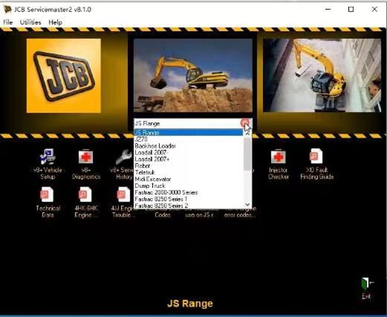 JCB Service Master is a gateway application allowing a large number of Vehicle Support Applications to be linked using one familiar interface. The interface acts as a graphical tool for selecting the target vehicle from a groups of Vehicle Families and triggering the particular Service Tool Application desired. This removes the need for a user to 'remember' every individual service tool available and select which one if intended for a particular machine.