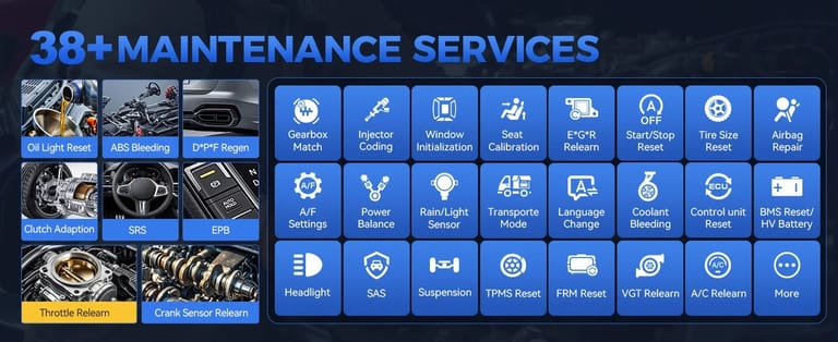 Maintenance functions are also including TPMS Reset, Air Suspension, Gear Learning(Crankshaft Relearn), Gearbox Match, Headlight Adjustment, Window Initialization, Seat Configurations, Disable Transportation, Tire Upgrade, EEPROM, Electronic Pump Activation, Power Balance, A/F Reset, Start/Stop Reset, etc, are all available and continuously growing.