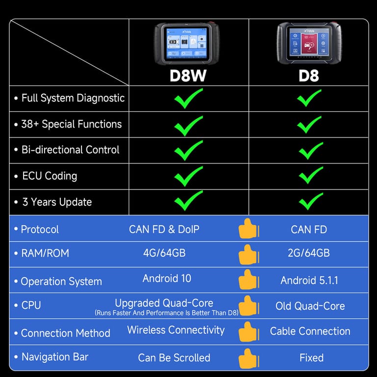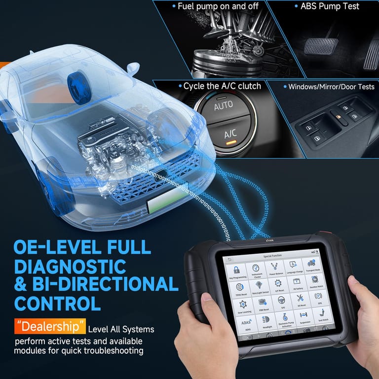 XTOOL D8W auto scanner diagnostic tool can access and scan all available modules and systems in your vehicle; such as ECM, TCM, ABS, SRS, BCM, IMMO, BMS, TPMS, SAS, fuel system, light system, Wwiper system, A/C system, etc. To perform OE-level full diagnostic functions.