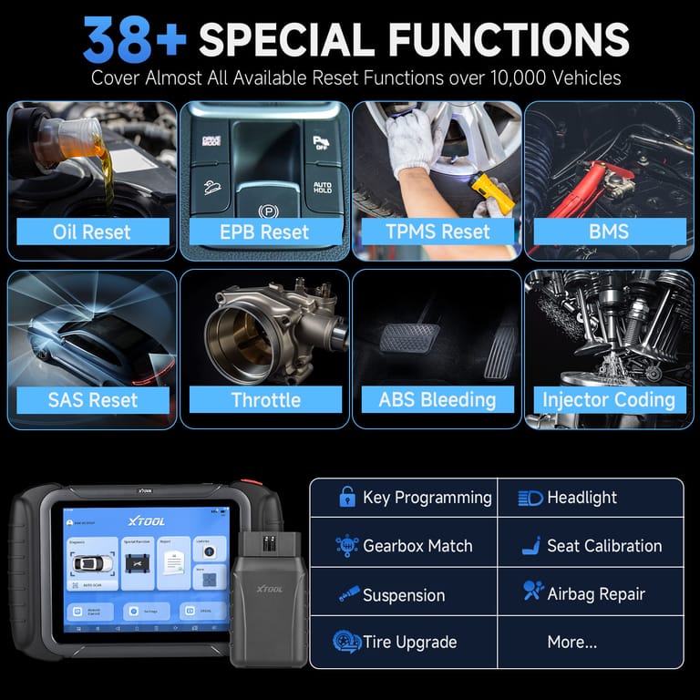 Other Special Functions Includes: Throttle Relearn, Suspension Calibration, Trans Adaptation(Gearbox Match), TPMS Reset, ABS Initialization, Seat Calibrations, Zero Point Calibration(of yaw rate sensor/seat weight sensor, etc), Window/Door/Sunroof, Headlight Adjustment, Airbag Reset(airbag reset and clear airbag crash data), Idle Relearn, Power Balance, Transport Mode, Tire Upgrade, Tooth Learning, VGT Learn(VGT Turbo Calibration), Fuel Trim Reset, Fuel Alcohol Composition Reset, Air/Fuel Reset, Start/Stop Reset, Language Change, and continuously growing.